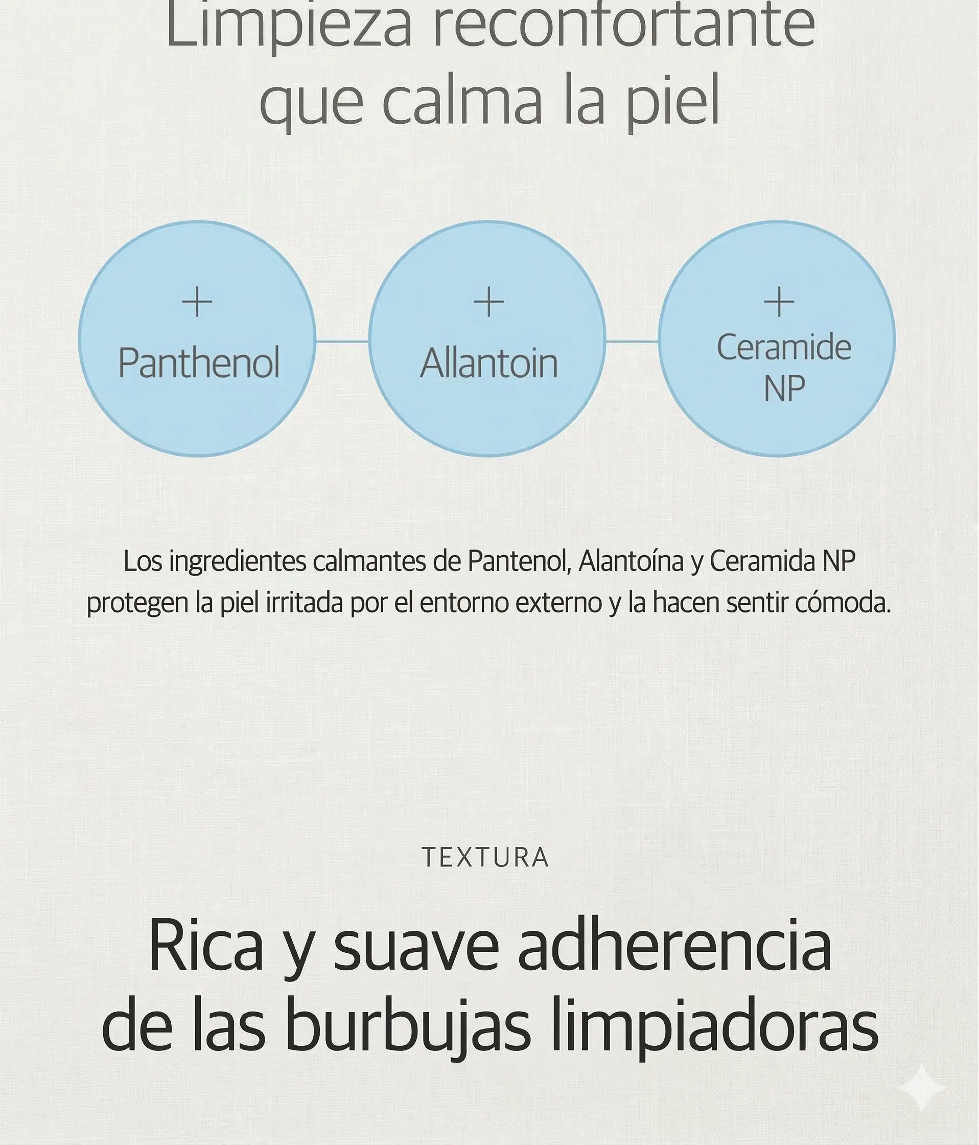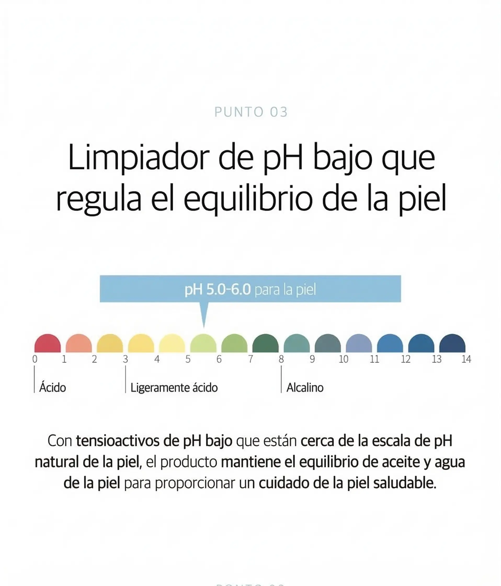 Limpiador facial coreano de pH bajo con textura de crema a espuma, ideal para la limpieza diaria sin dejar sensación de resequedad excesiva. Formulado con agua marina profunda de Ulleungdo, ácido hialurónico, panthenol, allantoin y Ceramide NP, ayuda a remover impurezas y exceso de sebo mientras apoya la hidratación y el equilibrio de la piel.