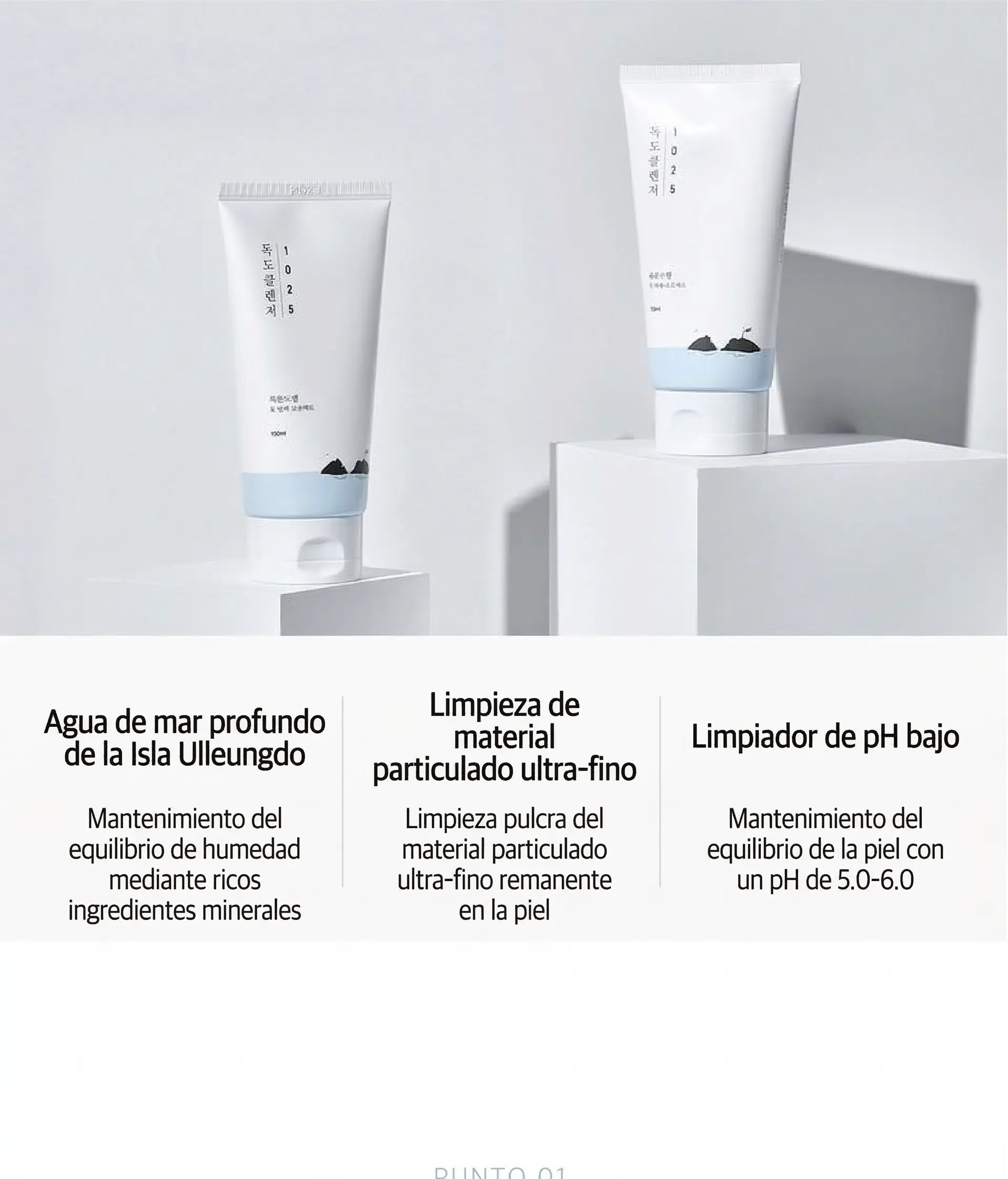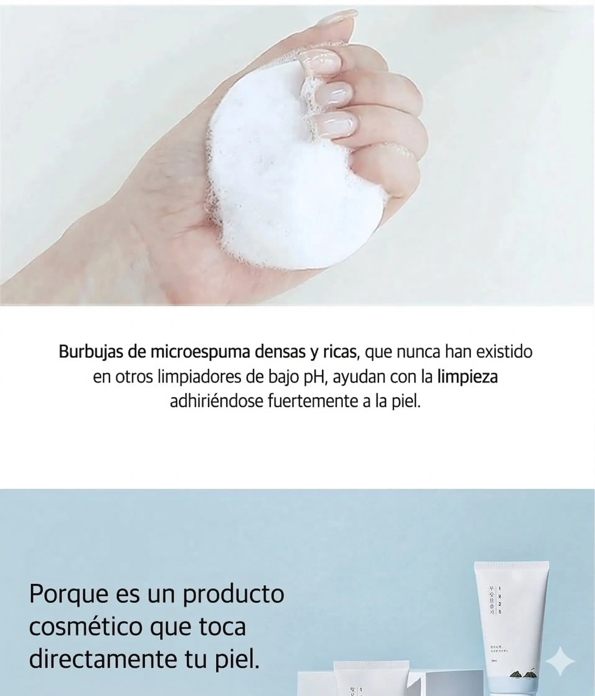 Uno de los puntos más distintivos de esta línea es el uso de agua marina profunda de Ulleungdo, extraída a 5,000 pies bajo el nivel del mar, rica en minerales como magnesio, calcio y más de 90 elementos y minerales naturales, según la marca. En este limpiador, Round Lab combina esa base mineral con activos de soporte como Triple Hyaluronic Acid, Panthenol, Allantoin y Ceramide NP, pensados para limpiar sin dejar la piel tirante y apoyar la sensación de confort e hidratación.