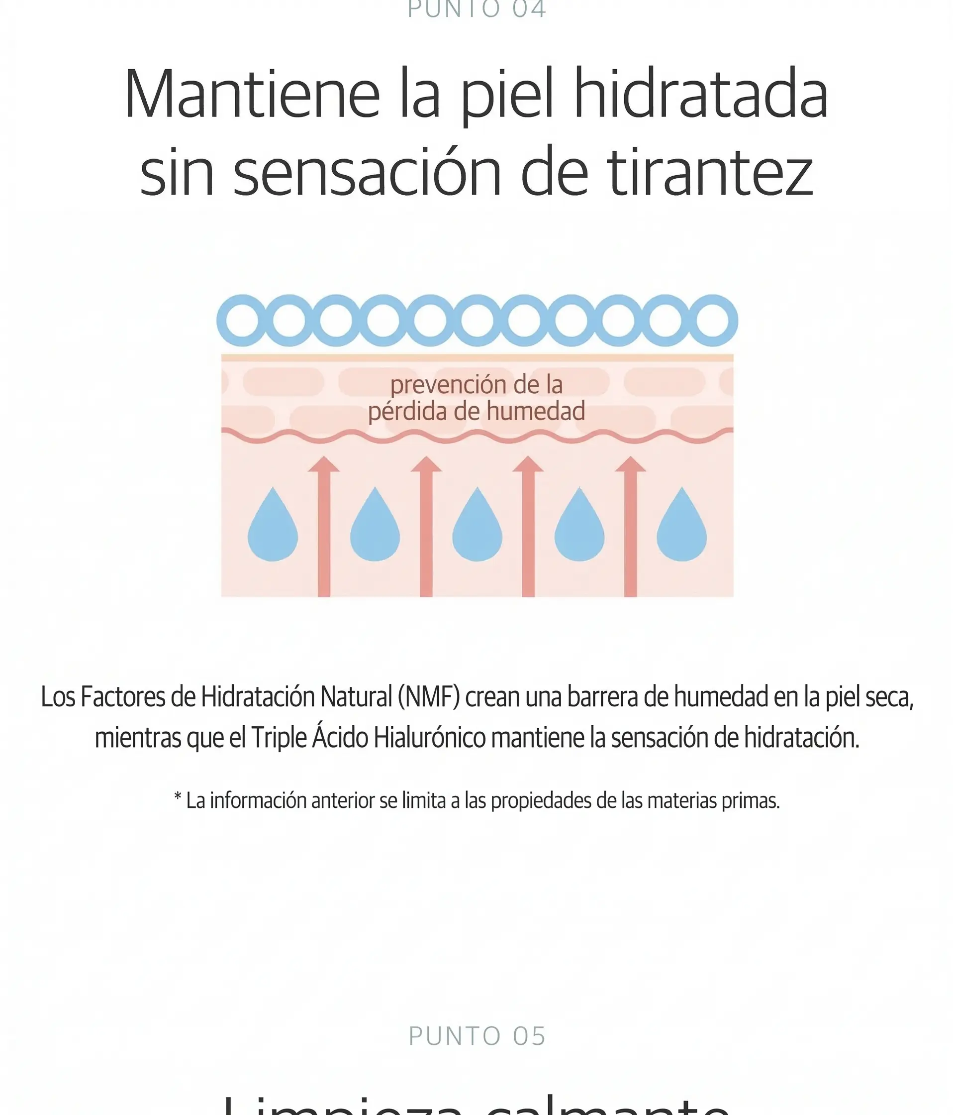Ácido hialurónico + Hydrolyzed Hyaluronic Acid + Sodium Hyaluronate: varias formas de humectación para apoyar una piel más flexible y menos tirante tras la limpieza.